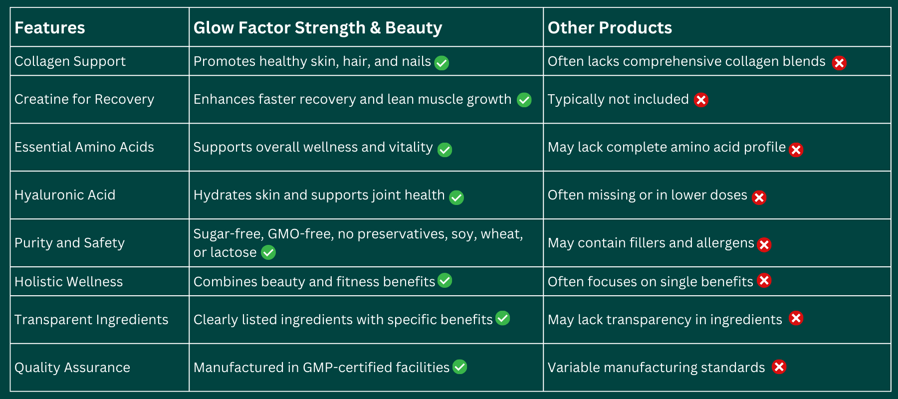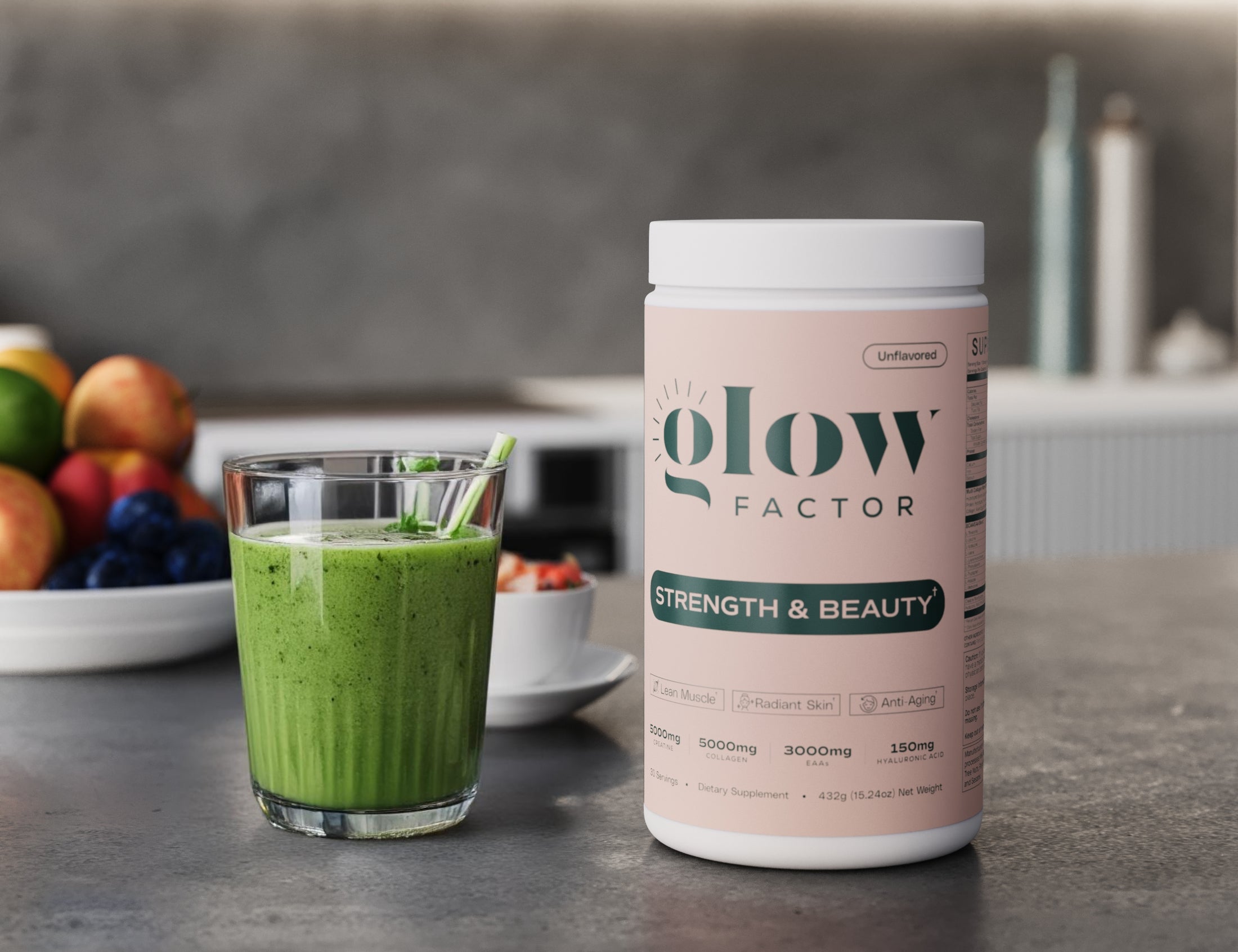 Glow Factor Strength & Beauty combines the power of creatine, collagen, essential amino acids, and hyaluronic acid. These ingredients work synergistically to promote healthy skin, hair, nails, joint support, and muscle recovery.
